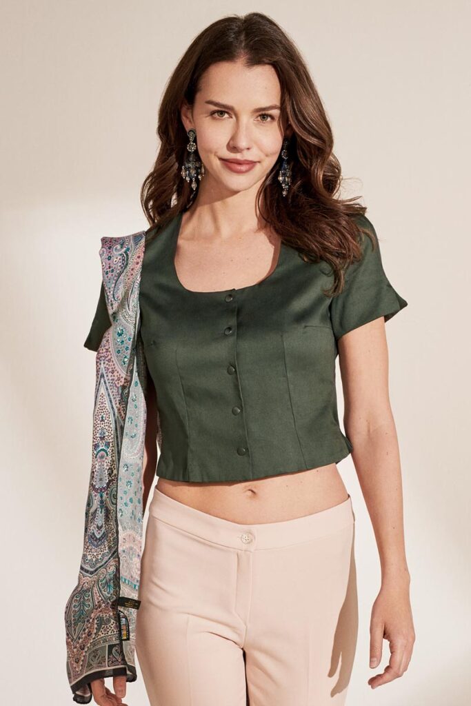 - Nähen einer gekürzten Bluse mit Schneewittchenkragen und Formbesätzen am Ausschnitt